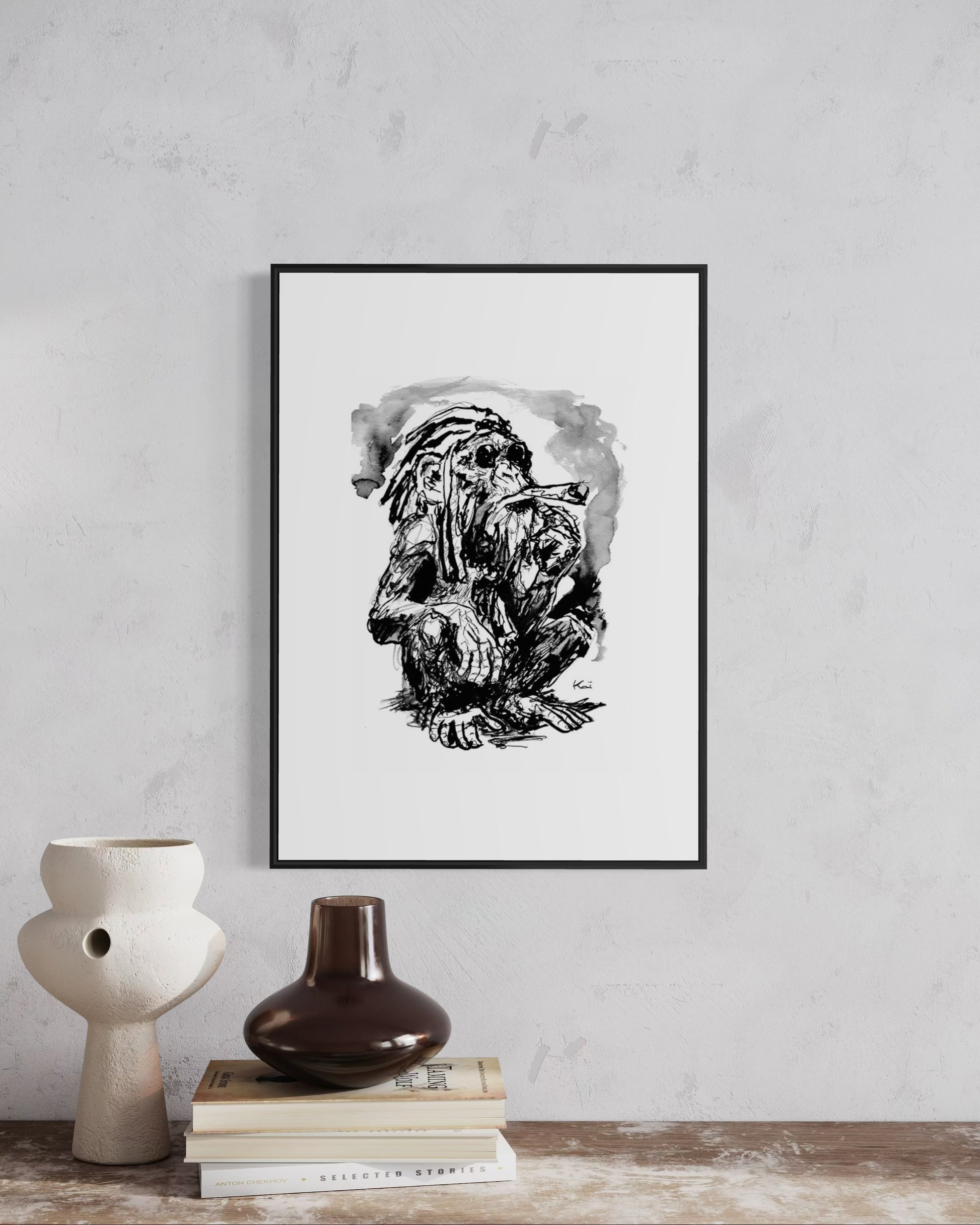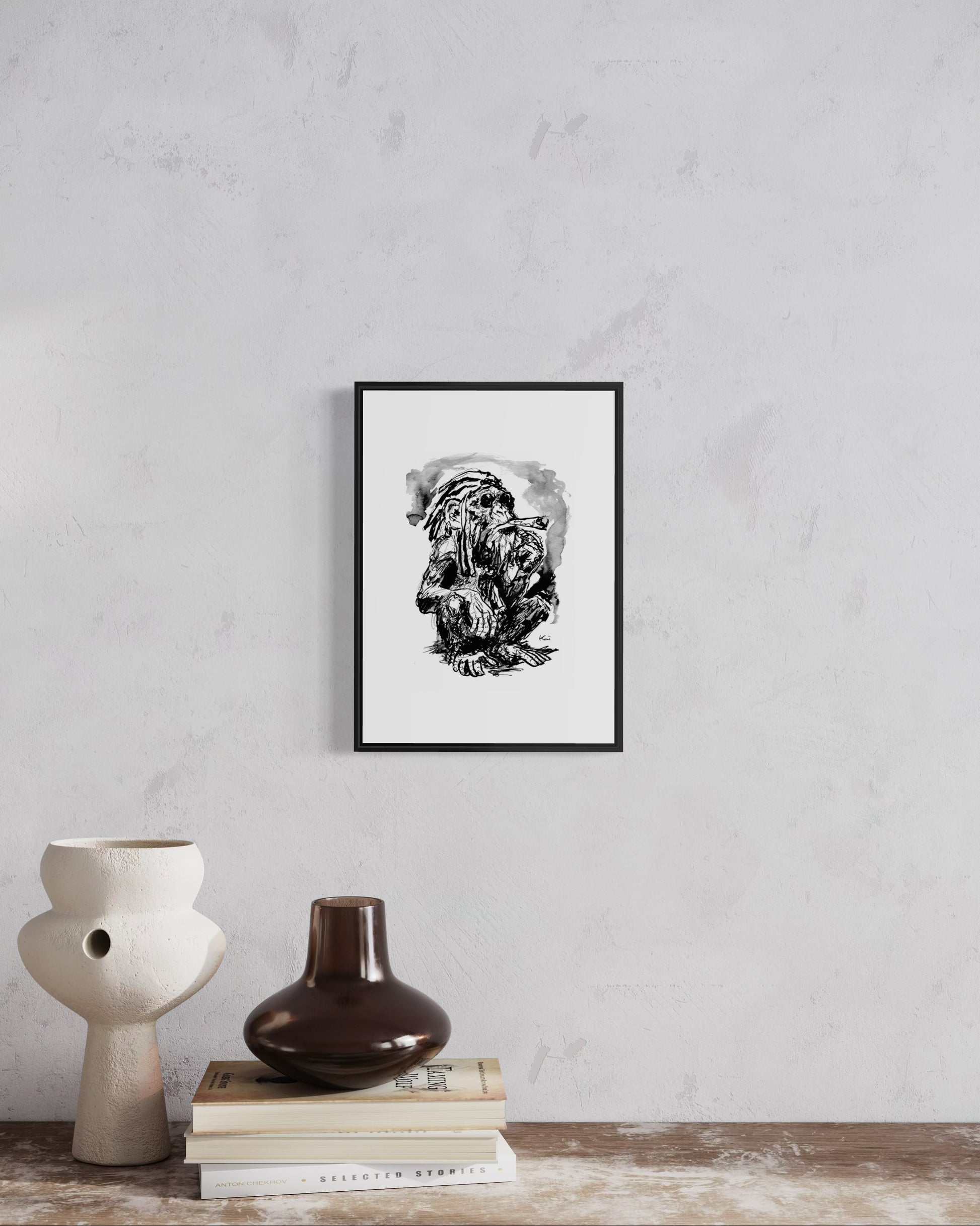 Replié, presque méditatif, le singe semble suspendu hors du tumulte.